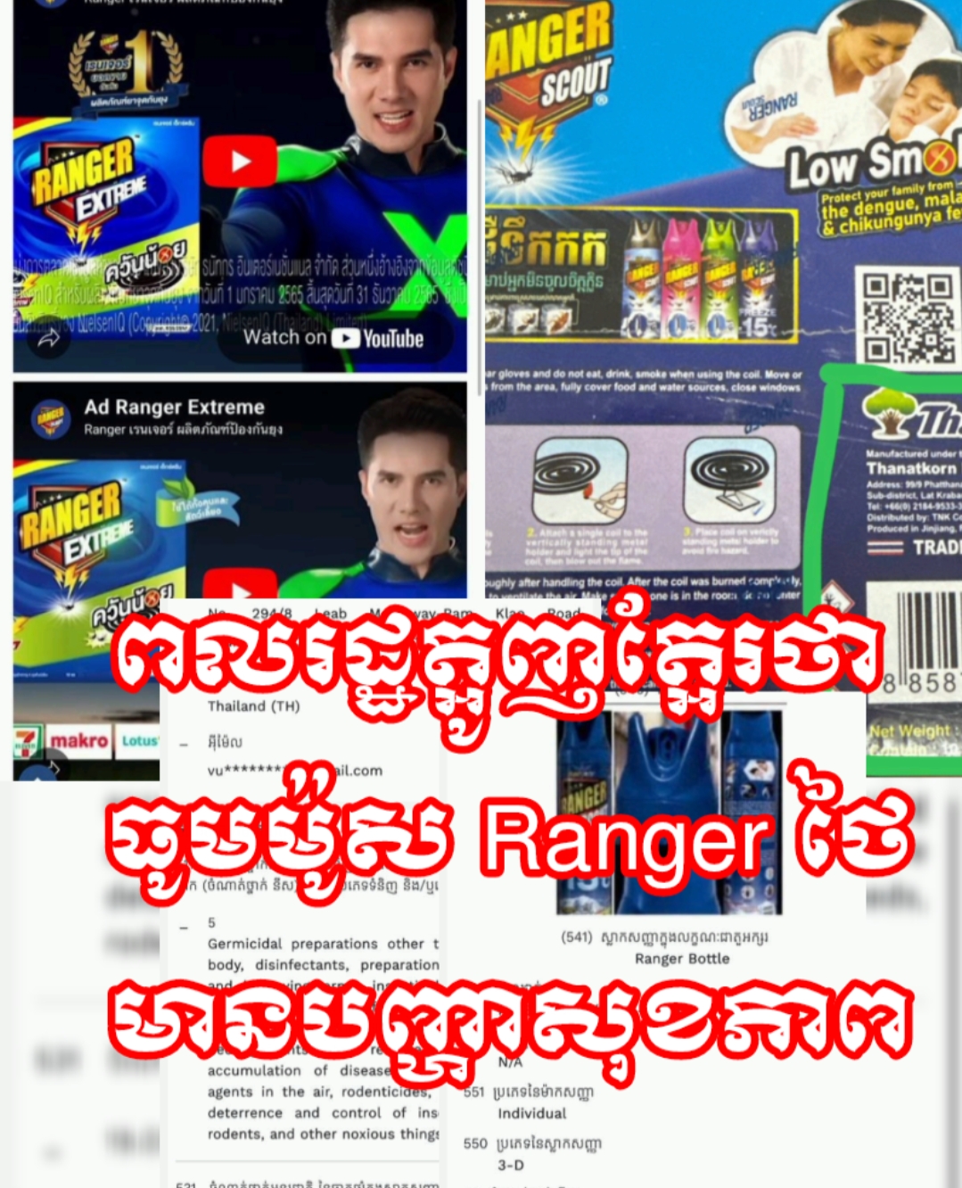 ក្រុមហ៊ុនមួយនៅកម្ពុជាទើបតែបង្កើតថ្មីអាចនឹងមានអ្វីជាប់ពាក់ព័ន្ធទៅនឹងក្រុមហ៊ុនរបស់ថៃលក់ធូបមូសម៉ាក Ranger ដែរឬទេ ស្របពេលមានជនជាតិខ្មែរ និងឥណ្ឌា សុំចេញមុខបញ្ជាក់លើបញ្ហាទាំងអស់នោះដែលពលរដ្ឋបង្ហាញអំពីផលប៉ះពាល់សុខភាពក្មេងៗនៅតាមជនបទ!