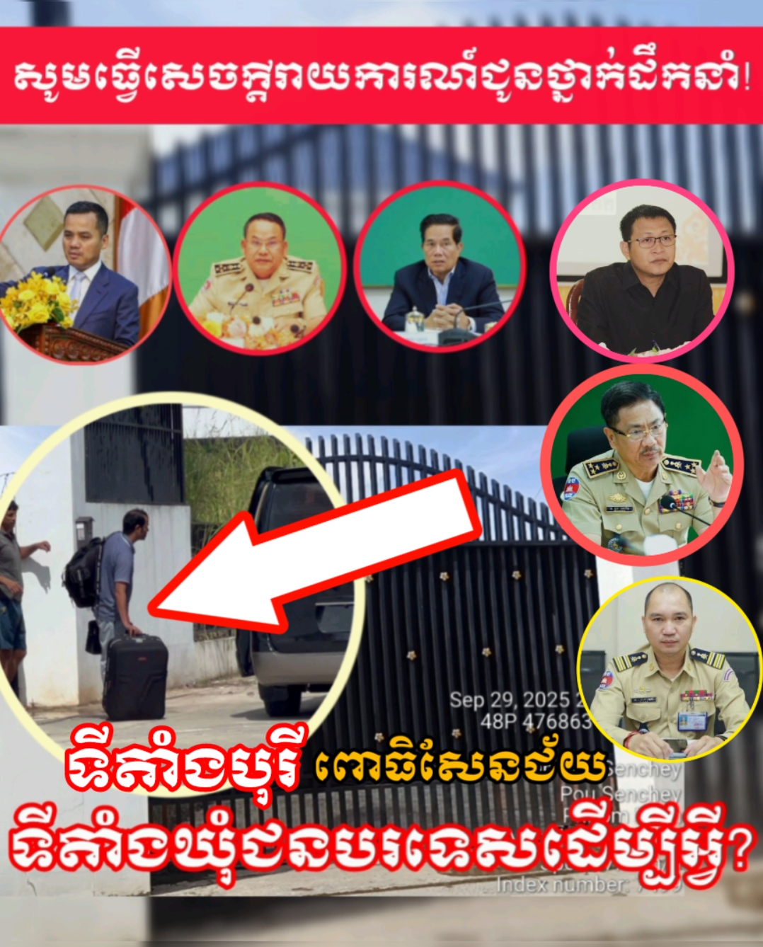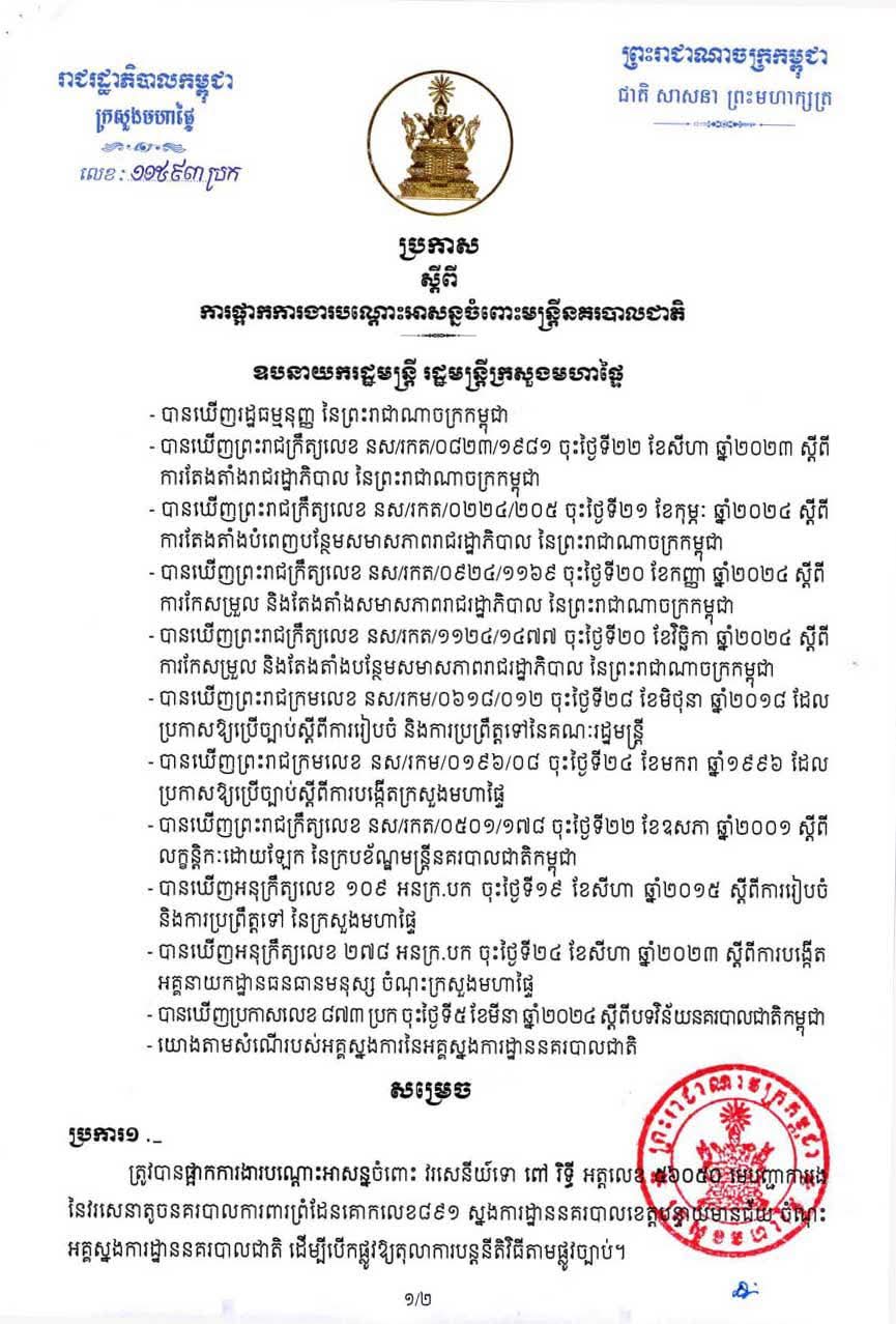 ប្រកាសស្តីពីការផ្អាកការងារ ចំពោះវរសេនីយ៍ទោ ពៅ រិទ្ធី មេបញ្ជាការរង នៃវរសេនាតូចនគរបាលការពារព្រំដែនគោក លេខ៨៩១ នៃស្នងការដ្ឋាននគរបាលខេត្តបន្ទាយមានជ័យ ដើម្បីបើកផ្លូវឱ្យតុលាការ បន្តនីតិវិធីតាមផ្លូវច្បាប់!