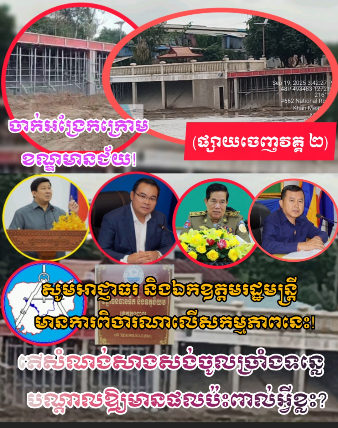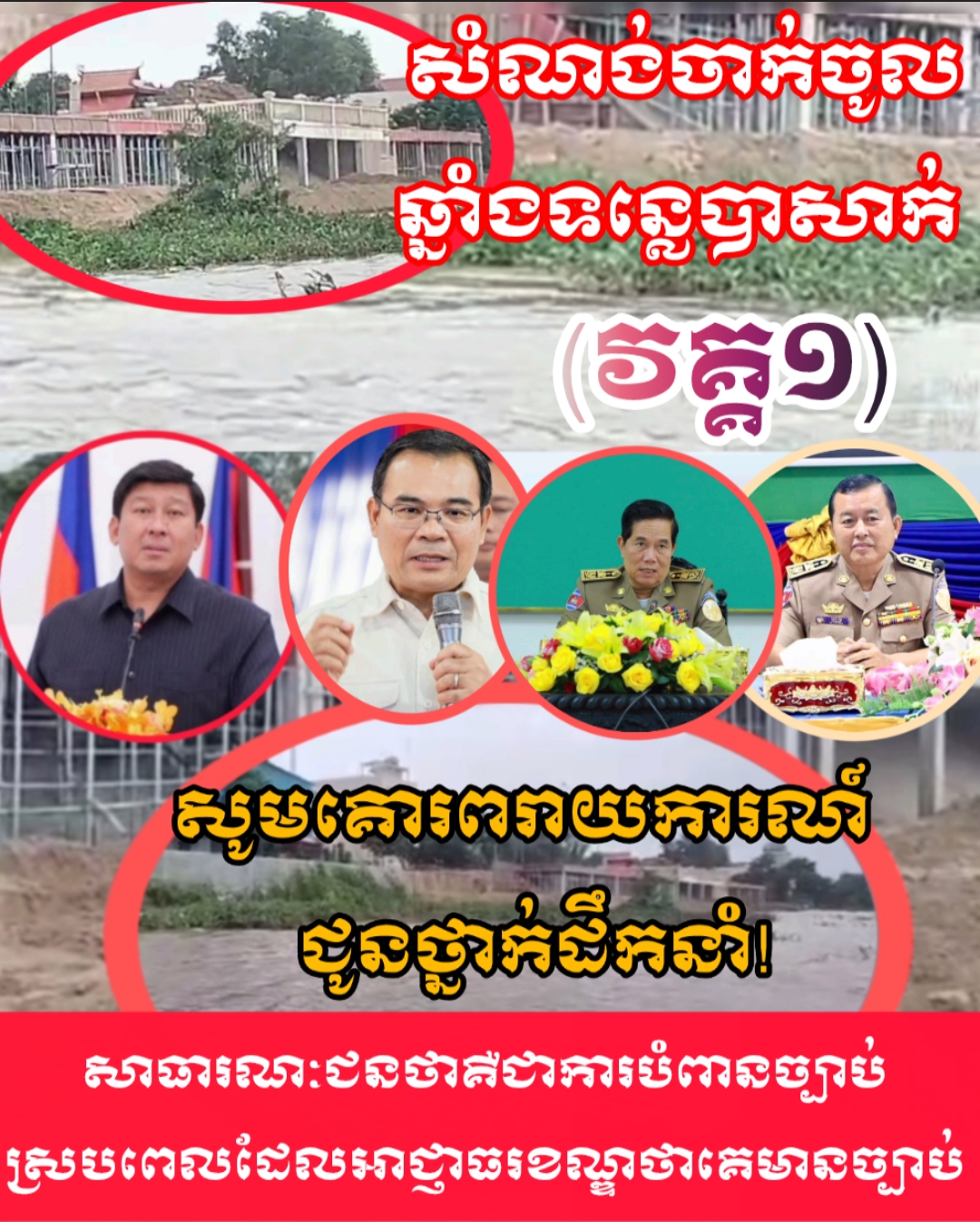 ភូមិគ្រឹះដ៏ស្គឹមស្កៃមួយកន្លែង កំពុងទាក់ទាញចាប់អារម្មណ៍ មហាជននិងអង្គការសង្គមស៊ីវិលដែលមានទីតាំងស្ថិតនៅ ឃុំកំពង់អុស ស្រុកពញាឮ ខេត្តកណ្ដាល មិនដឹងថាមានលិខិតការអនុញាតិ អោយសាងសង់ឬមួយយ៉ាងណា ដោយសារចាក់ដីច្រាំងទន្លេជាង១០ម៉ែត្រ វគ្គ១