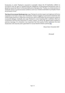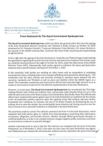 Press Statement of Spokesperson of the Royal Government of Cambodia reaffirmed Cambodia’s steadfast commitment to the full implementation of the Joint Statement on the Kuala Lumpur Peace Agreement and called upon the Thai side to fully respect and adhere to the same.